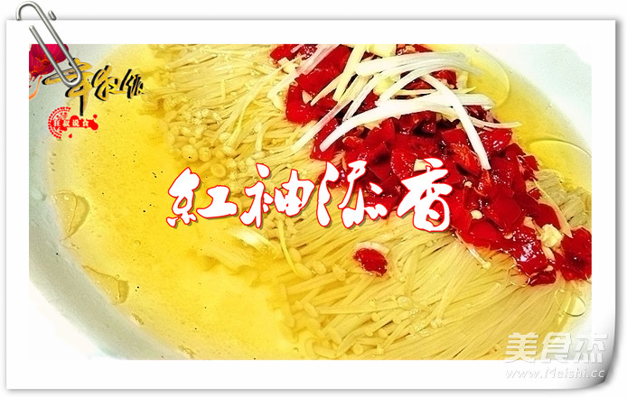 年夜饭系列菜 主料 金针菇250克 辅料 剁椒酱4茶匙 独蒜1颗 味精1/4茶匙 葱白1/4根 食用油适量 红袖添香的做法 1.金针菇,拆细浸泡、洗净、滤水; 2.剁椒,加蒜颗、味精拌匀。 3.将剁椒汁浇在金针菇面上; 4.蒸锅上汽,将盛盘放其中; 5.大火,加盖蒸5、6分钟; 6.关火后,焖5分钟左右夹出。 7.放大葱白丝,将热油淋在上面即可。