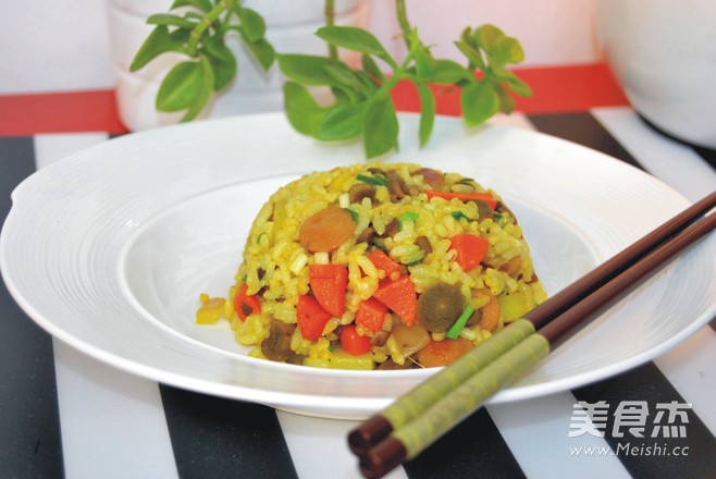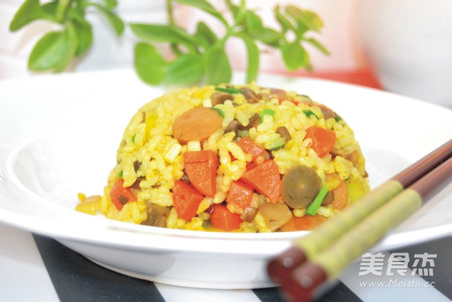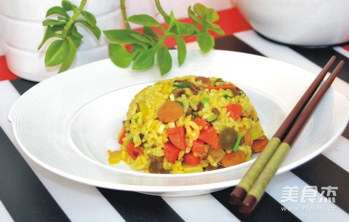 能预防老年痴呆症和对人体能起到增加胃肠蠕动,增进食欲的咖哩,是很有益身体健康的~炒饭可以根据自己的口味和食材变换出种类万千,一道咖喱炒饭很惹味地撩动着你我味蕾....... 主料 洋葱半只 香肠(法兰克福)1根 土豆1小只 胡萝卜半根 米饭1碗 辅料 咖哩粉1勺 现磨黑胡椒少许 葱末1把 盐适量 咖哩炒饭的做法 1.起锅放油,油热后放一勺咖哩粉,煸炒均匀 2.放入洗干净的切小块的洋葱煸出香味 3.再分别倒入胡萝卜块,土豆块和切小的肉肠一起煸炒至熟 4.然后加入米饭,翻炒至米饭松散后 5.加少许的盐,现磨的黑胡椒粉炒匀,出锅时撒上葱末 6.装盘,开吃啦 烹饪技巧 个人感觉炒饭里放土豆很不错哦,就是要先将土豆蒸熟,去皮切丁