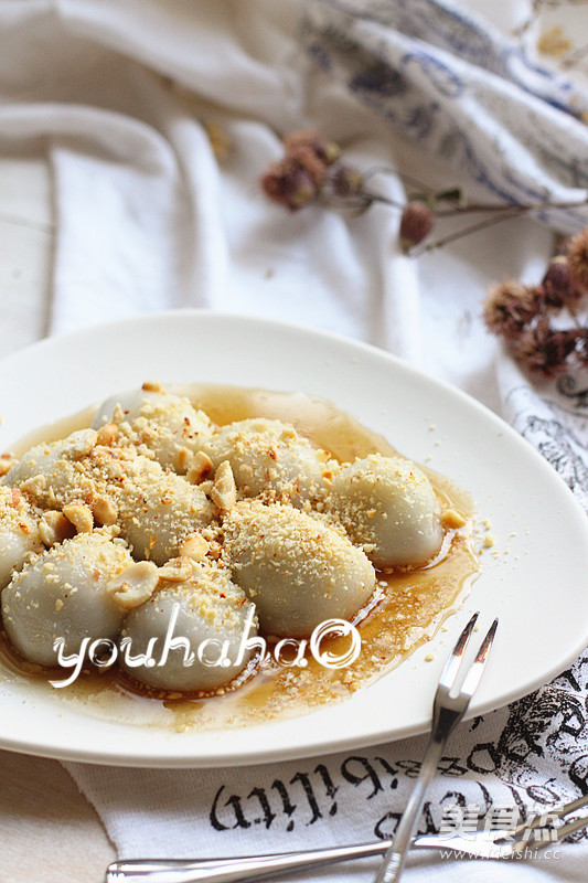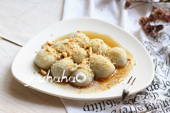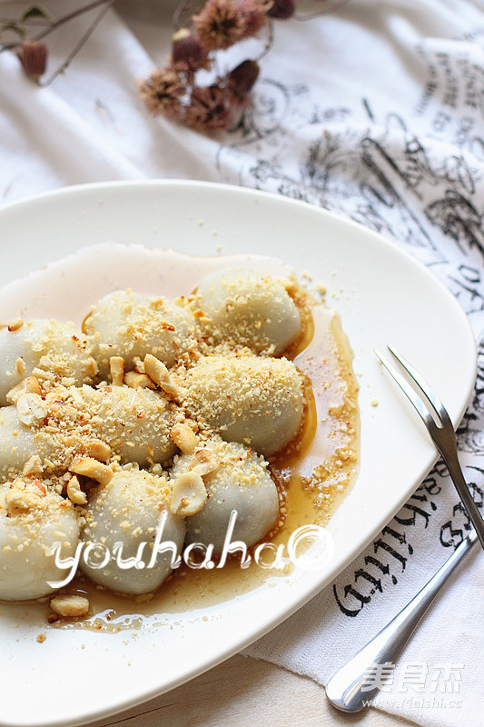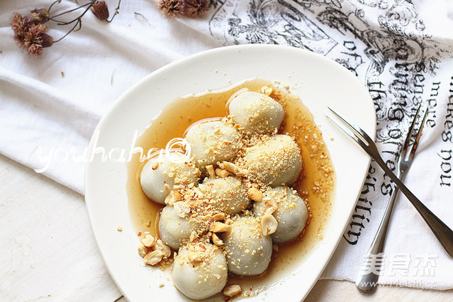 8.捞出装盘,浇上红糖水,撒上花生碎即可