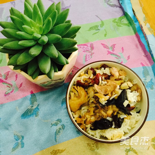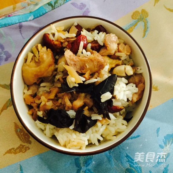 宝贝超喜欢这样做饭 主料 鸡腿200克 红枣30克 鸡蛋60克 辅料 油20克 盐5克 蚝油5克 咸菜15克 枸杞10克 云耳5克 姜10克 鸡腿饭的做法 1.准备好材料 2.鸡肉切小件,姜切丝,咸菜切粒,红枣去核,云耳预先浸发好 3.鸡肉里加入姜丝、油、盐和蚝油腌30分钟 4.煮饭至开始收水时 5.打入鸡蛋,放入所以材料,盖上盖,煮至饭熟,饭熟的时候,鸡肉也熟了 6.盛出香喷喷的鸡腿饭享用吧 烹饪技巧 鸡肉要预先腌一下,更入味