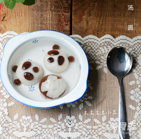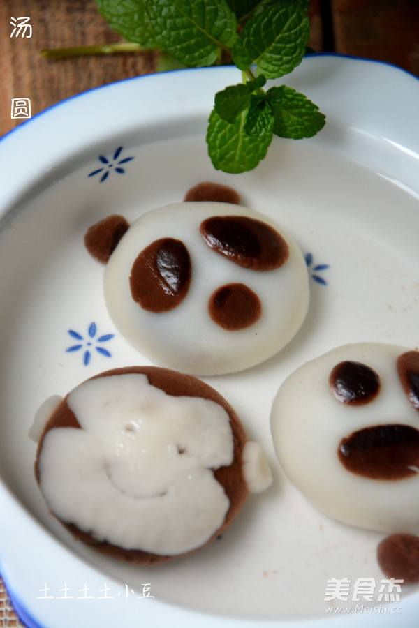 7.熊猫汤圆的成品图,煮的时候,特别要注意一下,水烧开,下锅前往锅里倒少许冷水,让水不再沸腾后,下卡通汤圆,这样,耳朵什么的,都不会掉了.等汤圆浮起来以后,再煮上1-2分钟,即可