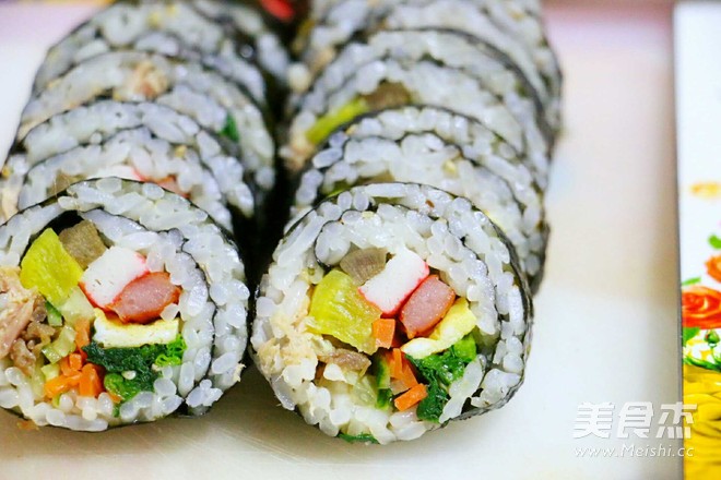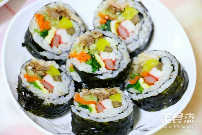 紫菜1包 酸甜萝卜1袋 金枪鱼罐头1个 沙拉酱适量 米饭3人份 鸡蛋2个 香肠1个 黄瓜1根 蟹肉1袋 胡萝卜半根 菠菜1把 牛肉70g