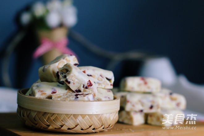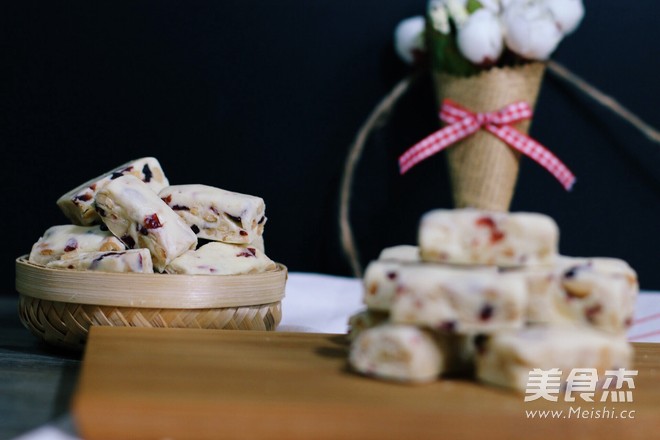 1.花生去衣后用擀面杖稍加擀碎并放入烤箱100度低温保温,蔓越莓也切成碎粒。