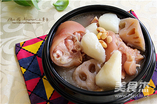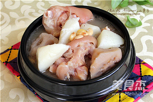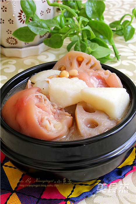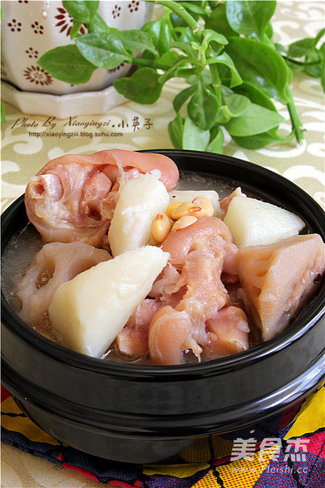 黄豆里的大豆异黄酮是一种结构与雌激素相似,具有雌激素活性的植物性雌激素,延迟女性细胞衰老、使皮肤保持弹性、养颜、减少骨丢失,促进骨生成、降血脂等。在平时适量多吃黄豆,还能有效达到预防老年痴呆的功效。再炖的猪蹄汤中加入黄豆是一道对身体益处多多的食材,在汤中再添加莲藕山药还有利于脾胃消化吸收功能,煮熟的藕性味甘温,能健脾开胃,益血补心有降低血糖的作用。男士多吃山药,女士多吃藕是当下最流行的养生之道。