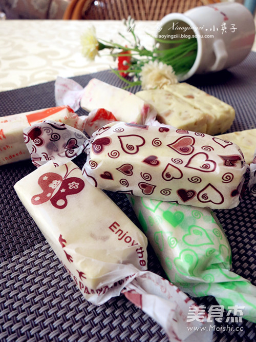 15.放在案板上,按喜欢的大小先切成条再按糖纸大小切成块,包上糖纸即可