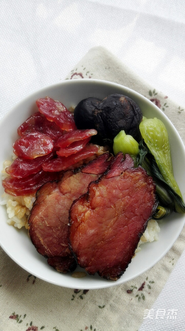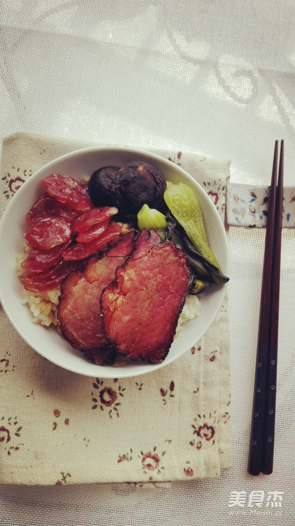 一直以来,我们家都是喜欢吃腊味的,因为有年味,妈妈喜欢吃腊肉,我喜欢吃腊肠,做一锅煲仔饭,满足了我们俩,很不错哦! 主料 大米2杯 腊肠1根 腊肉5片 干香菇5个 辅料 蒸鱼鼓油5汤匙 腊味煲仔饭的做法 1.大米洗净,放适量水开始蒸米饭,选择煲仔饭功能键 2.准备材料,干香菇洗净温水泡发10分钟 3.腊肠和腊肉切片备用,青菜洗净切半备用 4.待煮至充分沸腾时,放入腊肠,腊肉,青菜,香菇,盖锅盖继续煮 5.待完成后,焖10分钟,开锅盖,沿着锅壁浇入鼓油即可食用 6.出锅后即可食用 烹饪技巧 放米煮饭前,锅底可以先刷一层油,有不粘的效果