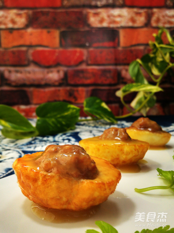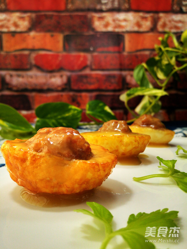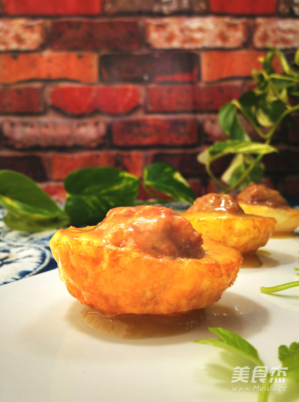 3.将蛋黄推出,把肉馅团成球,放在蛋黄的位置