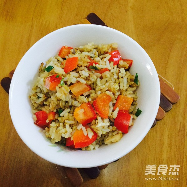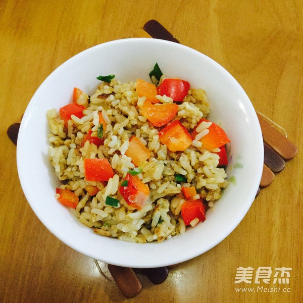 中午饭做多了,晚餐就炒饭吃吧 主料 米饭500克 鸡蛋100克 彩椒50克 香葱10克 辅料 油20克 盐8克 生抽5克 蚝油3克 彩椒炒饭的做法 1.准备好材料 2.圆椒切丁,香葱切葱花 3.起油锅 4.加入彩椒、葱花和少许盐,炒至熟,盛出 5.另起油锅,加入米饭 6.加入盐、生抽和蚝油,翻炒均匀,结块的米粉用铲稍稍压一下,打饭搅散 7.打入鸡蛋,迅速翻炒 8.加入炒熟的彩椒 9.加入葱花便可 烹饪技巧 米饭不能有结块,如果有,可以用铲稍稍压一下,搅散