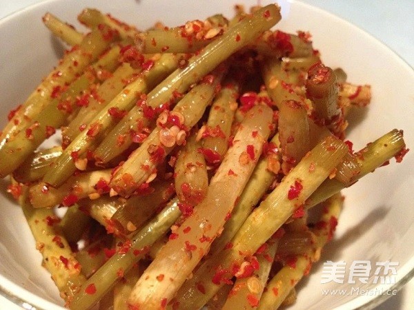 4.将干辣椒、草果、八角打出来的粉末放进蒜薹里,用筷子或者勺子混合均匀。