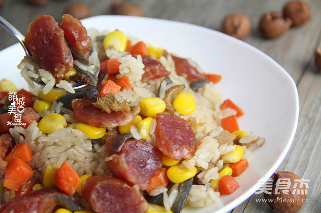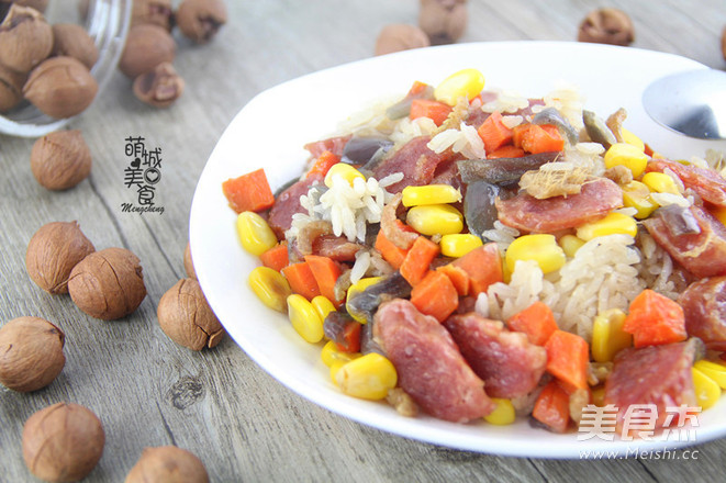 2.油倒入锅里烧开,放入生姜爆炒,放入玉米粒、腊肠、红萝卜跟洋葱进行翻炒