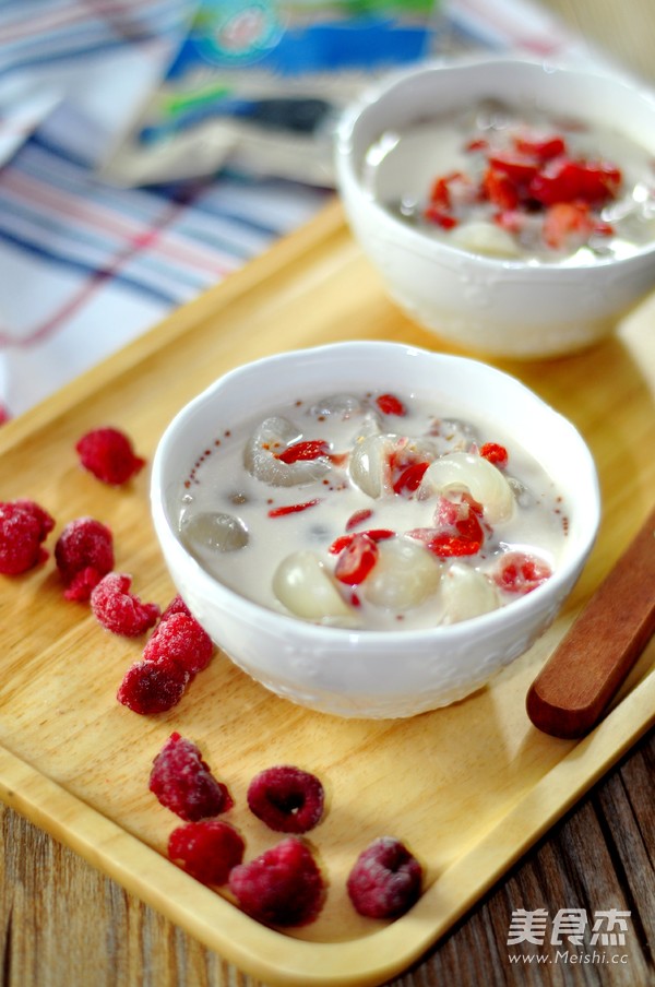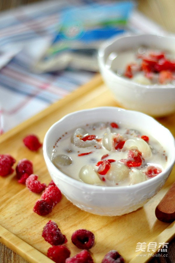 新鲜的桂圆皮薄汁多,在这干燥的季节最适合用来做甜品了。椰香、奶香,果干的酸甜,让人久久回味。 主料 桂圆200克 枸杞10克 椰奶20毫升 淡奶油50毫升 辅料 水150毫升 冰糖10克 桂圆蔓越莓甜心奶露的做法 1.准备材料。枸杞用水浸泡10分钟,洗净。 2.桂圆剥去皮、去核,洗净。 3.桂圆、枸杞、果瑞氏蔓越莓果干,加入水。 4.放入蒸烤箱中,100度,蒸15分钟。 5.蒸好后,取出。 6.倒入椰浆、冰糖、淡奶油,搅拌均匀。继续蒸10分钟,至冰糖融化即可。 烹饪技巧 可以用别的新鲜水果代替,比如荔枝、桔子、苹果.......