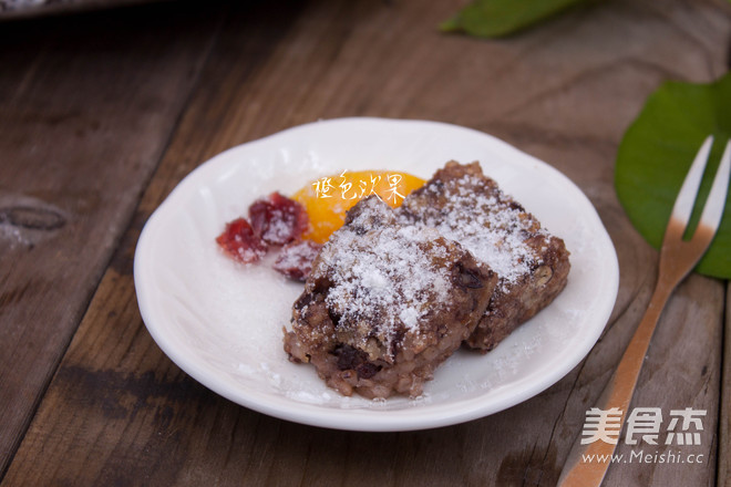 1、糯米浸泡时间仅供参考,可根据水温及气温不同缩短或延长,达到轻松捻碎的状态即可。 2、模具的尺寸是27*9*6(CM),正好盛下此配方的量,您也可以选择自己手头上有的容器。 3、模具刷上油是为了便于后期糯米饭脱模。 4、油煎后的糯米饭更香,口感也有层次,洒上白糖,装饰一下,配上些清爽的水果特别好吃。 5、糯米是黏性的,一次进食不宜过多。