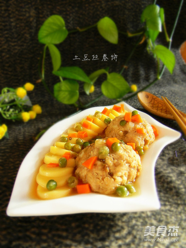 在团狮子头的时候,在手上抹上一层薄油,这样肉糜不粘手。 切玉子豆腐的时候要轻,小心切破,要不就不美观了。