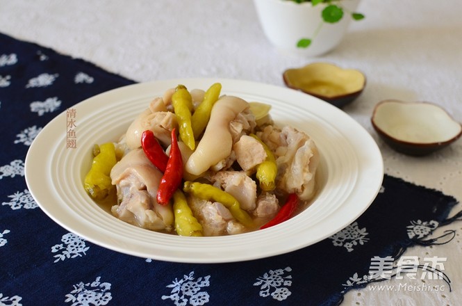5.焖好的猪蹄放凉后捞入调料汤水中,将泡椒和泡椒水一起倒入,放置2小时候入味即可食之了,(夏天就要放入冰箱中保存了)。