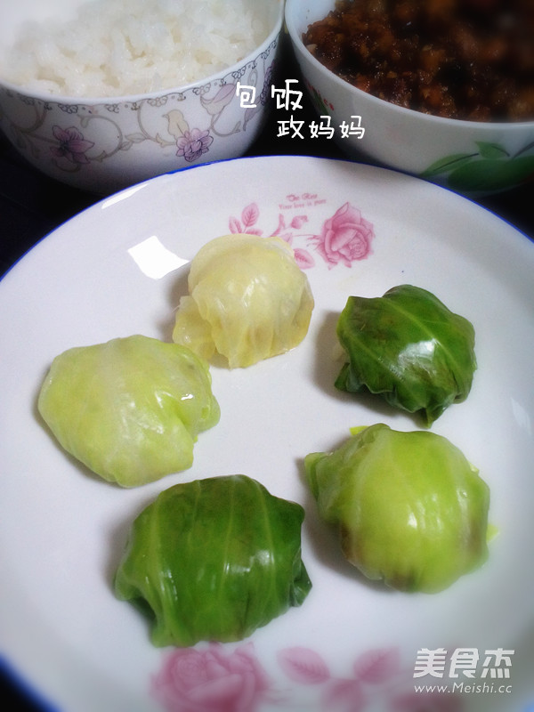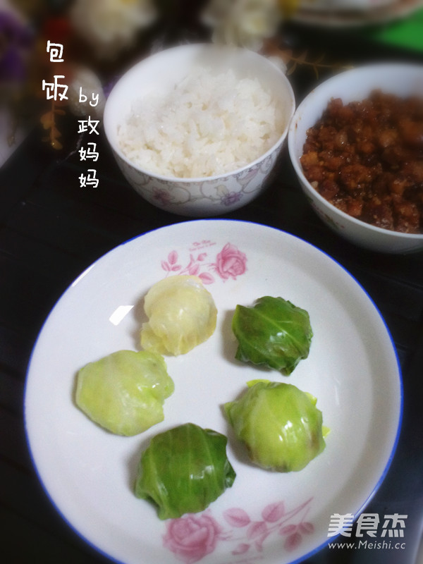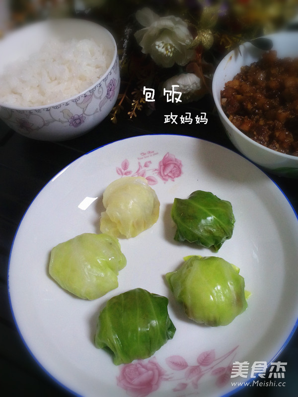 9.取一片包菜叶,加入米饭和炒好的酱包起来食用。