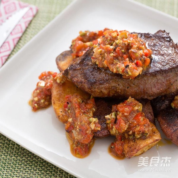 6.发挥你的美术功底装盘!用烤土豆在盘中打底,放上牛排,浇上亲手制作的西班牙甜椒番茄酱.与心爱的人一起享用亲手制作的健康美食吧!