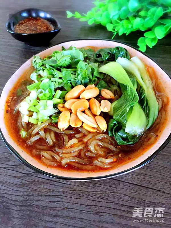 8.捞一碗,放上焯好的青菜,葱碎,香菜,麻辣花生开吃。花生可以自己用生花生米过油炸熟,我家里有这个就省事了。