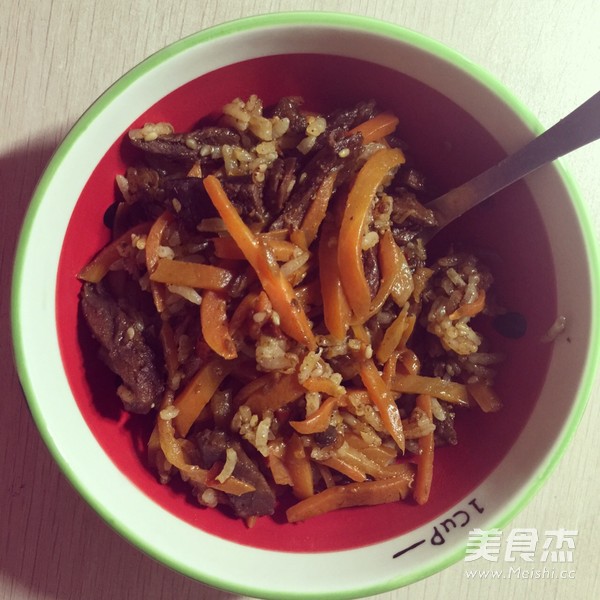 2.预热结束煮饭键跳起后,打开锅盖,倒入袋装牛肉干和胡萝卜。按下煮饭键开始翻炒。