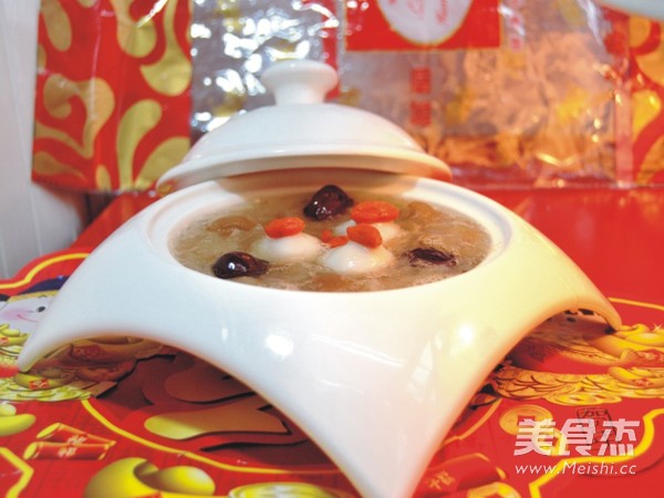 6.到时,开锅就看到银耳粘稠加冰糖,开盖按下煮饭键继续煮5分钟即可。