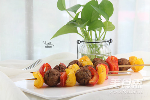 4.用竹签把肉丸和彩椒串起来