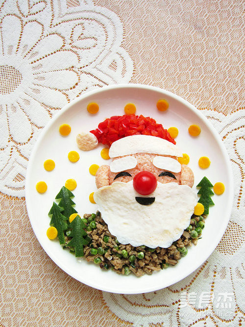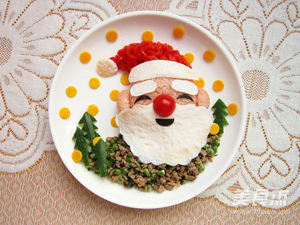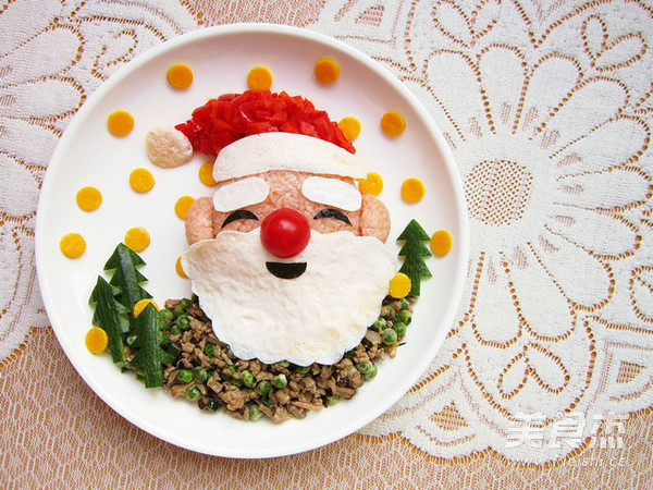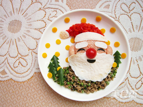 10.为圣诞老人加上五官和帽檐,再摆上圣诞树。最后将黄色小圆点缀在餐盘空白处,就完成了。