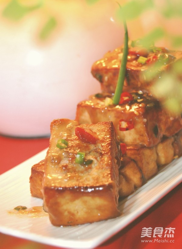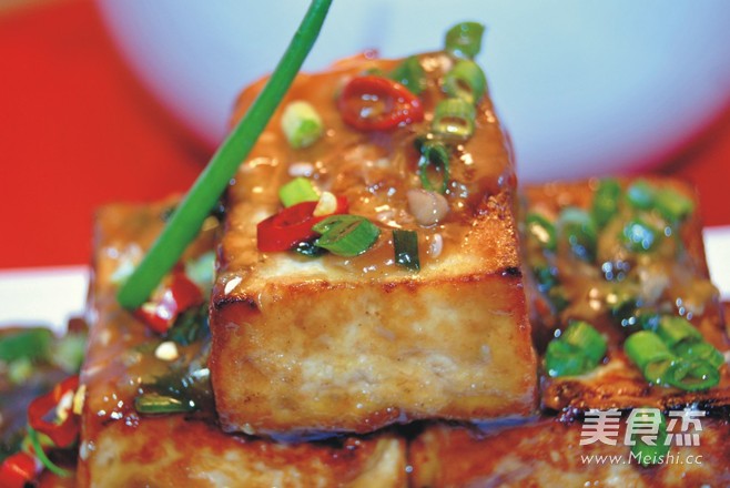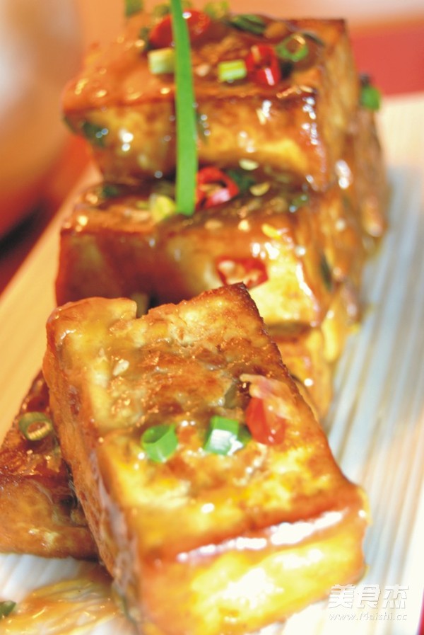 8.在煎好的豆腐中加入调好酱汁焖煮10分钟,用玉米淀粉芶芡即可出锅了