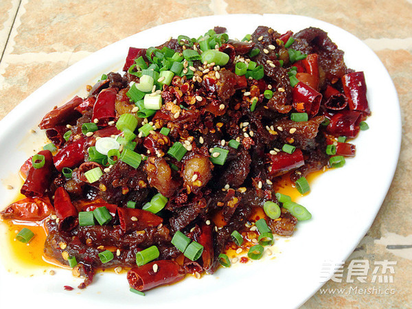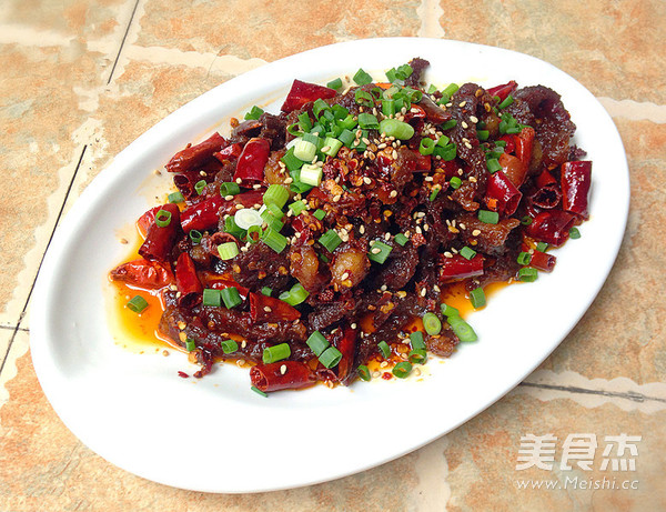 7.锅里再炒海椒花椒,炒香之后,把牛肉倒进去,加点味精、芝麻,炒均匀之后,起锅撒上葱花即可
