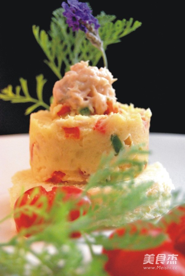 1.将洗净的红椒.青椒.黄椒.紫皮洋葱分别切碎.蒸熟的土豆压成泥待用.