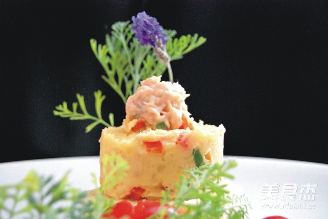 3.碗中放入土豆泥放一点盐.一点胡椒粉.加人切好的彩椒.洋葱碎.倒入雄鸡标沙拉金枪鱼.蛋黄酱.橄榄油充分拌匀.