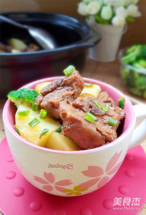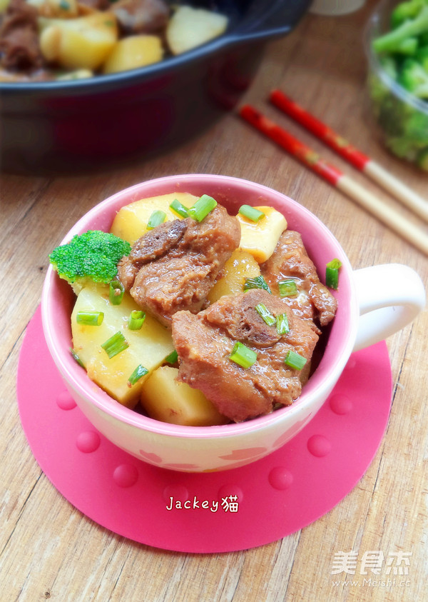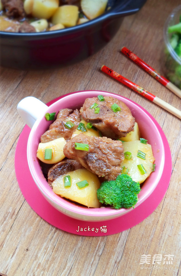 8.当排骨已经焖了10-15分钟,已经明显开始脱骨了,这时加入土豆块,继续焖5分钟