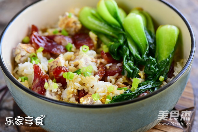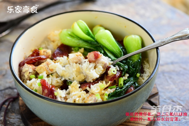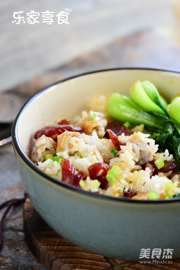 煲仔饭的优势是好吃容易做。米饭中弥漫着腊肠的油香。加入芋头,可以少吃点米饭,减肥O(∩_∩)O哈! 用烤箱做煲仔饭的好处是不会煮焦,火力容易掌控 主料 大米100克 芋头40克 辅料 腊肠1根 青菜适量 生抽适量 麻油适量 香芋腊肠煲仔饭的做法 1.大米洗净后,加上平时煮饭一样多的水,泡20分钟 2.加入芋头 3.烤箱选择下火功能,凹槽加入少量水,温度设定150度20分钟 4.时间到,煲仔饭出炉。加上焯水的青菜,淋上生抽麻油汁,开吃 烹饪技巧 如果不使用烤箱,也可以选择蒸或者砂锅直接煮