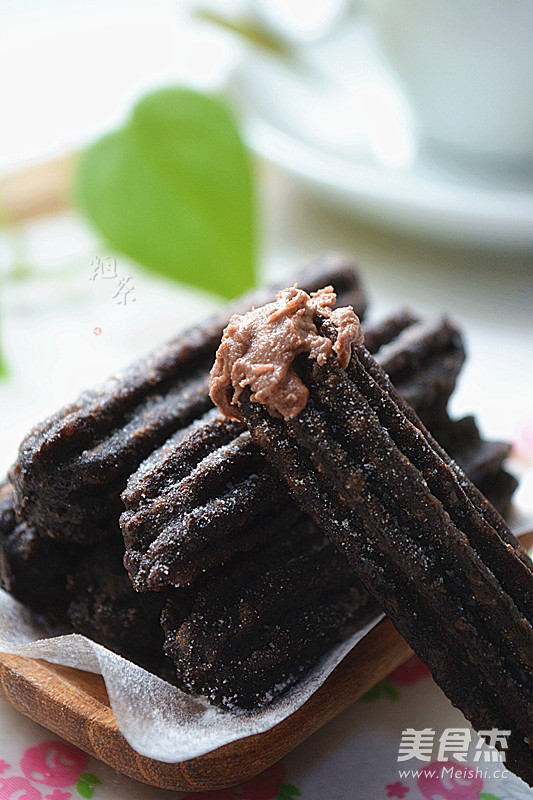 14.最后在炸好的油条上撒入糖粉,沾着奶油巧克力夹心酱,好好享用吧
