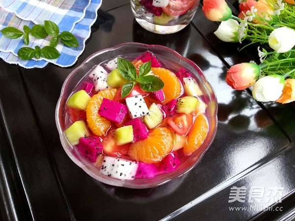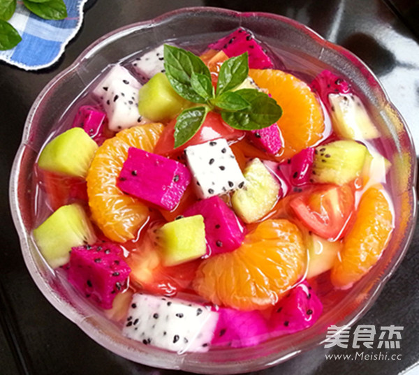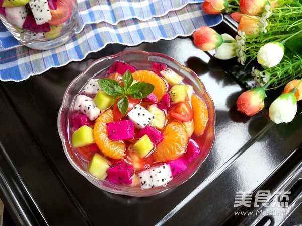 白糖25克 清水100克 红心火龙果1/4 桔子1个 弥猴桃1个 火龙果1/4
