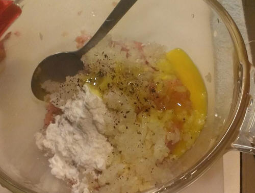 2、取一搅拌盆,将剁好鸡肉洋葱蒜末,盐,黑胡椒,玉米粉,蛋黄,拌匀。