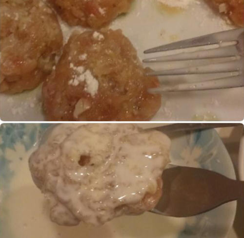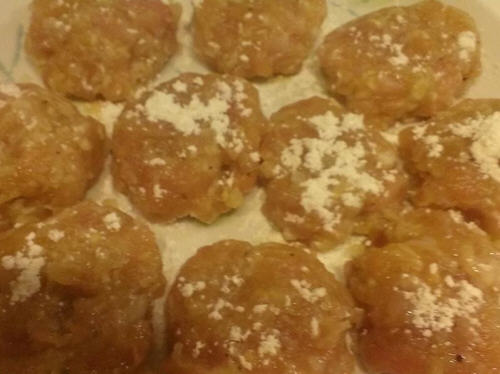 3、先在盘子上洒些面粉再将拌好鸡肉取大约一个汤匙大小整型,放置盘中,所有鸡块分好在上面洒些面粉.
