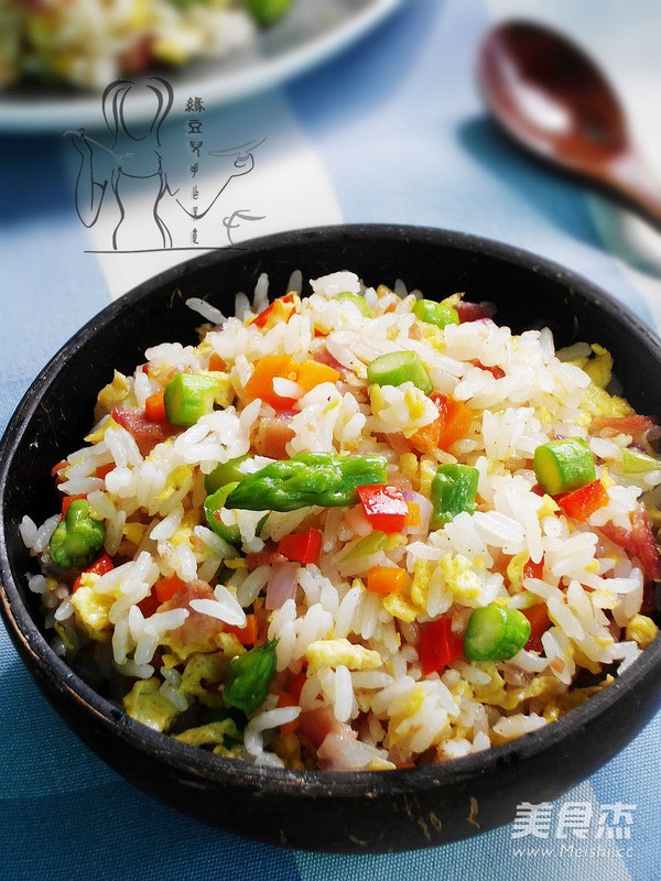 香米150克 鸡蛋2个 培根3片 洋葱1/4个 胡萝卜1/4根 红椒1/4个 芦笋100克