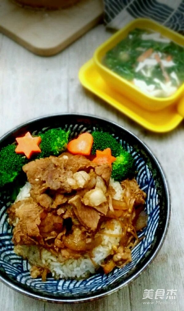 7.将牛丼淋在盛好的白米饭上面,再搭配一些绿色蔬菜就更好了
