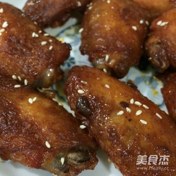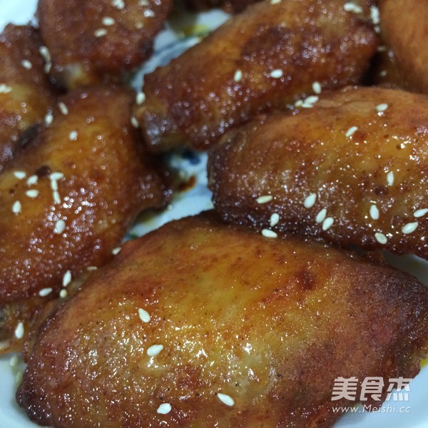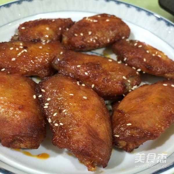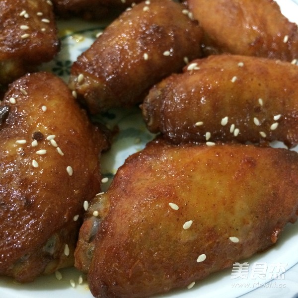 8.取出装盘撒上芝麻摆盘就可以吃了,当然你也可以为了好看摆在绿色的菜叶上,或者旁边做点装饰,这样一盘新鲜出炉的奥尔良烤翅可以赶超任何快餐店的奥尔良烤翅,不信你试试