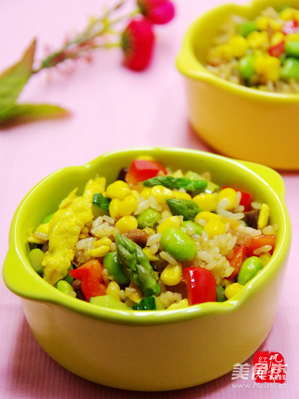 玉米粒50g 彩椒50g 洋葱50g 毛豆50g 鸡蛋2个 猪肉40g 黄瓜50g 盐2g 油25ml 芦笋50g