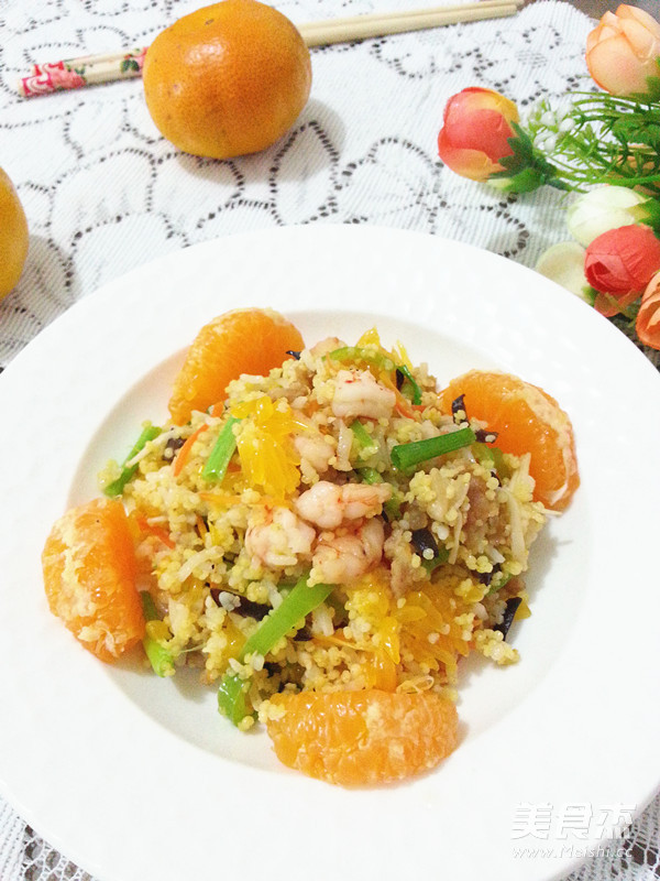 桔子要选用汁多的,才能挤出足够的汁液,炒在米饭里的桔子要剥掉桔瓣的外表皮,吃的时候会方便一些。这道菜看着步骤很多,但各种原料备齐后,炒起来就快多了。二米饭可是换成纯米饭或其他的米饭。