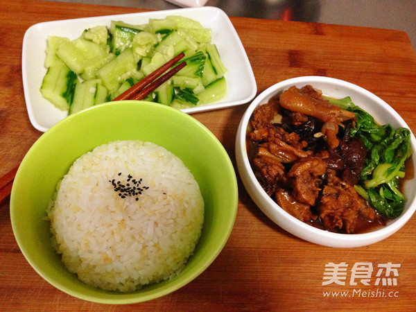 一个人做饭总觉得菜不够味道,这道焖烧鸡饭一定让你食欲大开的 主料 大鸡腿1只 榛蘑4朵 青菜1棵 米饭1碗 洋葱半只 辅料 料酒1勺 生抽1小勺 生姜1块 盐2克 蚝油1小勺 榛蘑鸡米饭的做法 1.鸡腿切小块,鸡油部分切丁,榛蘑泡发好,洋葱切片,生姜切片 2. 3.锅烧热,下油及鸡油煸出香味 4.下生姜片煸出香味 5.下鸡肉进行翻炒,下料酒,生抽,蚝油,盐等调料 6.加足水开始焖烧5分钟 7.再加入洋葱及榛蘑再焖烧5分钟 8.等汤汁少了下点青菜烫熟出锅,配一上碗米饭香喷喷地吃起来吧 烹饪技巧 生姜是关键不能少,不然香味就大打折扣