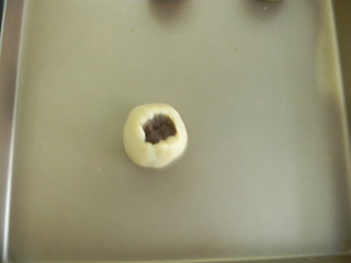 9.把饼皮压扁包上一个馅,用户口慢慢向上推捏包严。