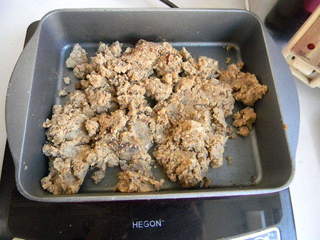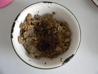 4.煮好的绿豆用小勺碾碎。加入红糖拌匀。