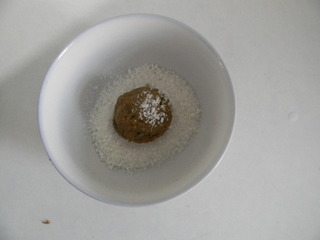 7.碗里装椰蓉,每个绿豆球到椰蓉里滚一下,用手轻轻用力团紧。