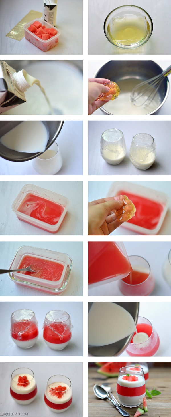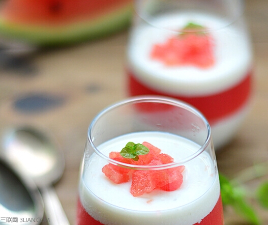 材料:牛奶250g 西瓜汁150g 白糖30g 吉利丁片20g