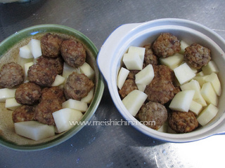 14.把蒸熟的土豆切块,和牛肉丸子一起放入小砂锅中