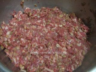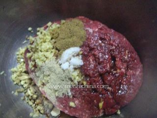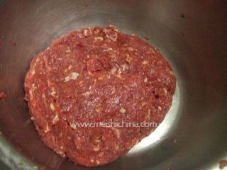 2.牛肉剁成馅后加姜、五香粉、胡椒粉、盐、生抽调味