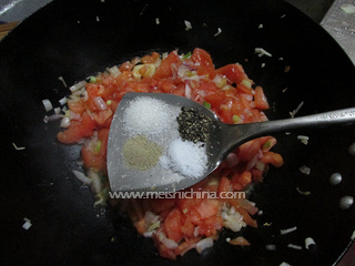 11.加入西红柿丁翻炒,加盐、糖、黑胡椒碎和白胡椒调味