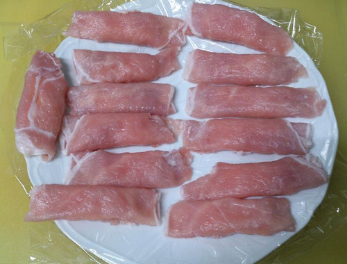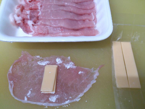 1、起司片,一切为五条,一片里肌肉片包覆一条起司片,肉片边边沾些太白粉,起司条对摺置中, 再把肉片卷起即可。