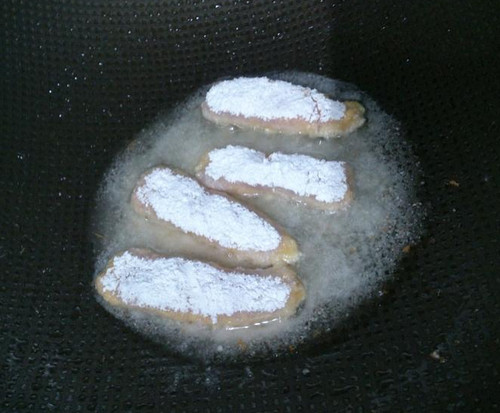4、锅里适量油微火慢煎肉卷两面, 我只有第一锅稍微有些起司流出来, PS.要煎第二锅时先把上一锅, 流出的起司渣渣滤掉, 肉卷煎起来面衣才会美美的唷。